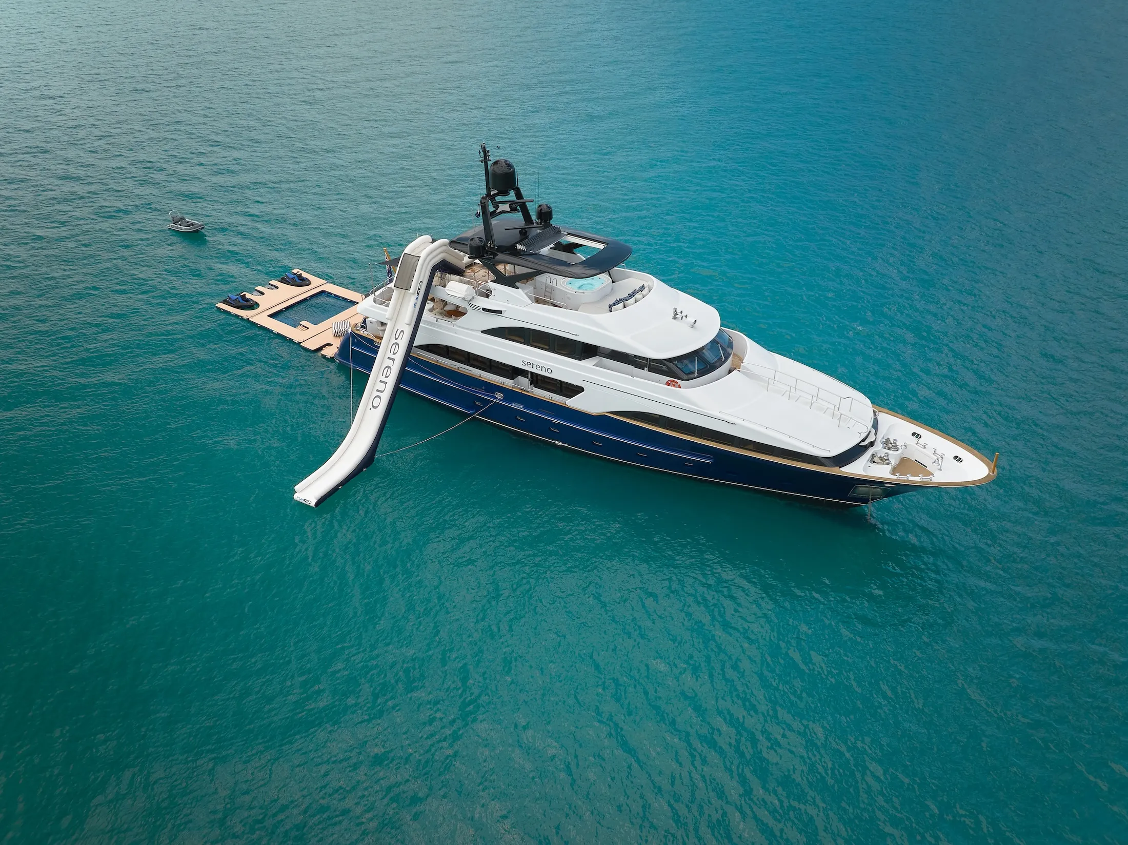 SERENO is designed as an entertainer's dream, with multiple lounging and al fresco dining areas spread across her decks. Whether hosting intimate gatherings or larger celebrations, the yacht offers versatile spaces that cater to every occasion. A full suite of water sports equipment and toys adds to the onboard entertainment options, ensuring endless fun for all ages.